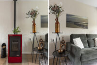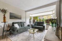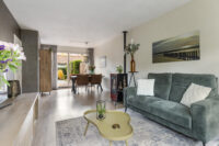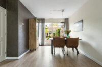 In de leefruimte valt het daglicht van twee kanten binnen. Aan de voorkant komt dat licht van de karakteristieke erker met veel glas, aan de achterkant van de grote schuifpui die bovendien vol zicht geeft over de achtertuin. De palletkachel deelt deze ruimte sfeervol in tweeën; het woon- en het eetgedeelte, beide ruim genoeg voor veel gezelligheid.