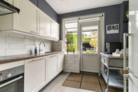 Gaat u maar voor, naar de praktische, gesloten, lichte keuken links van u, met een buitendeur die direct dienst doet als dagelijkse achterdeur. Aan de andere kant van de keuken scheidt een vouwdeur de ruimte van de hal, zodat u makkelijk rond loopt en met een paar stappen weer bij de kelderkast bent. Heel handig.