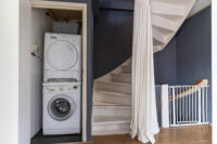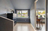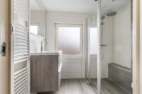 Via de trap in de hal, komt u aan op de optimaal ingedeelde bovenverdieping, met aan uw rechter hand de ‘waskast’, waar de wasmachine en de -droger hun werk kunnen doen. Ook is aan deze kant de moderne badkamer met inloop(regen)douche, designradiator, wastafel met -meubel en zwevend toilet.