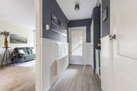 De gemetselde nis bij de voordeur van deze woning zorgt voor een droge entree, waarachter een voorportaal u verwelkomt. Hier is alle ruimte om u en/of uw gasten uw jas te laten ophangen. Voorbij de tussendeur loopt u verder, naar de hal met toiletruimte, trapopgang, kelderkast en de deur naar de leefruimte.