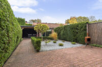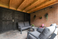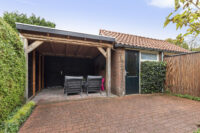 Deze tuin is aangelegd om met beperkt onderhoud optimaal plezier van te hebben. Aan de achtergrens ervan staat een stenen berging, met een zolder onder rode pannen zoals ze passen in de omgeving. Ook is hier op de achtergrens een veranda gebouwd voor eindeloze (zomer)avonden. Deze doet direct dienst als poort van en naar de gedeelde ‘achterom’.