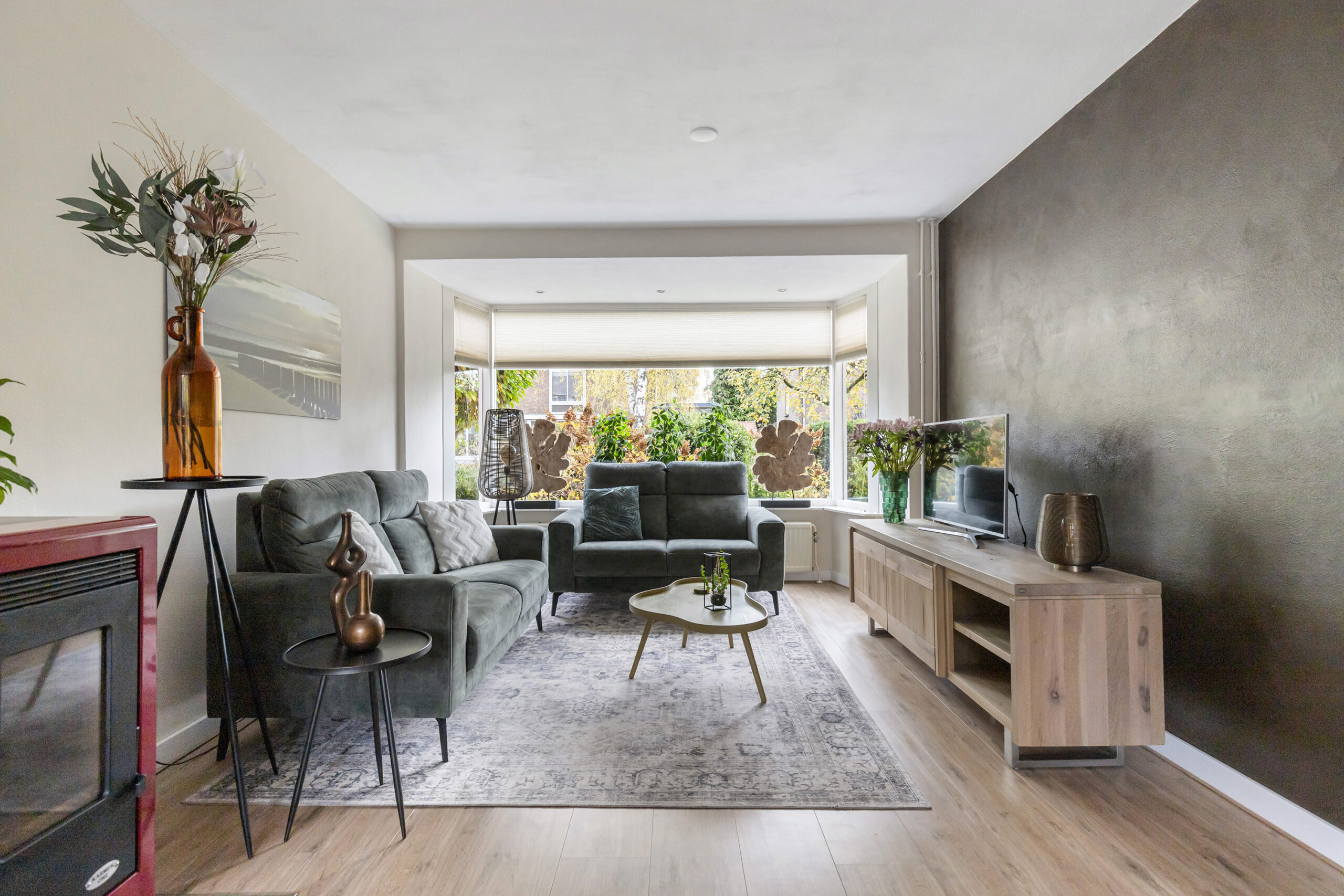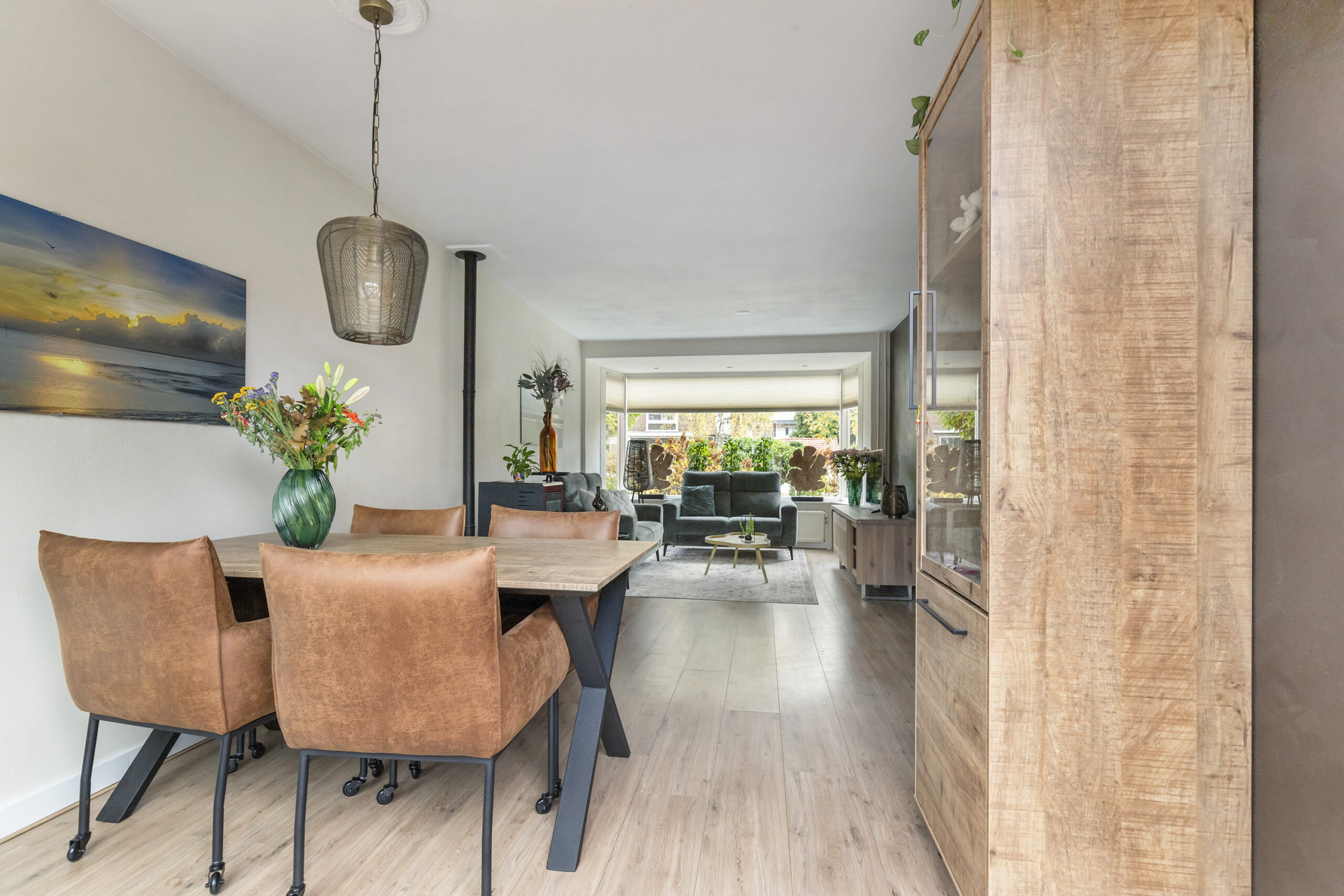In de leefruimte valt het daglicht van twee kanten binnen. Aan de voorkant komt dat licht van de karakteristieke erker met veel glas, aan de achterkant van de grote schuifpui die bovendien vol zicht geeft over de achtertuin. De palletkachel deelt deze ruimte sfeervol in tweeën; het woon- en het eetgedeelte, beide ruim genoeg voor veel gezelligheid.