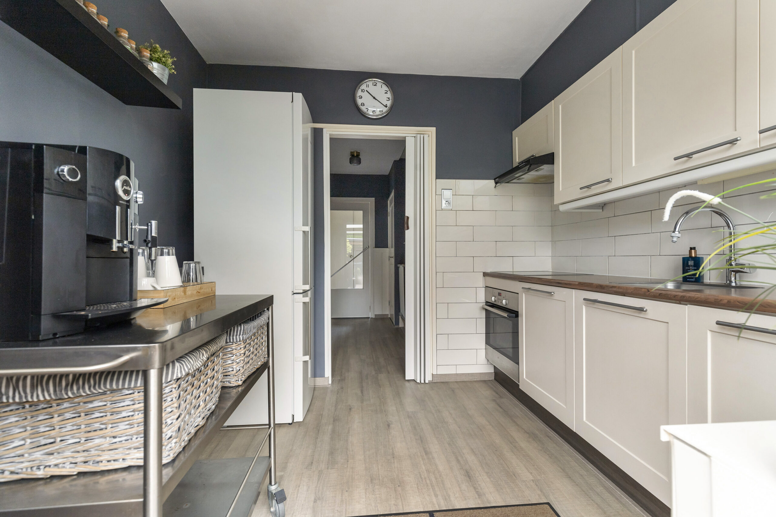Gaat u maar voor, naar de praktische, gesloten, lichte keuken links van u, met een buitendeur die direct dienst doet als dagelijkse achterdeur. Aan de andere kant van de keuken scheidt een vouwdeur de ruimte van de hal, zodat u makkelijk rond loopt en met een paar stappen weer bij de kelderkast bent. Heel handig.