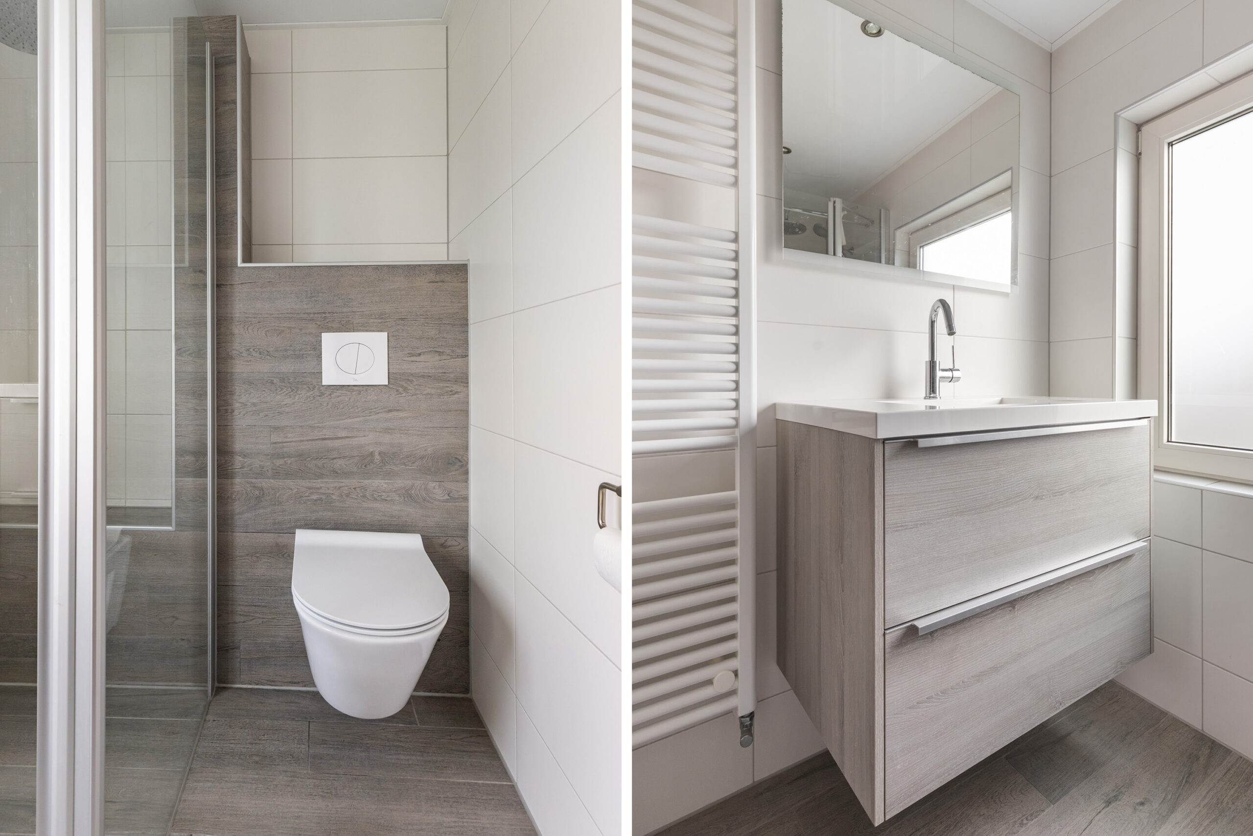 Via de trap in de hal, komt u aan op de optimaal ingedeelde bovenverdieping, met aan uw rechter hand de ‘waskast’, waar de wasmachine en de -droger hun werk kunnen doen. Ook is aan deze kant de moderne badkamer met inloop(regen)douche, designradiator, wastafel met -meubel en zwevend toilet.