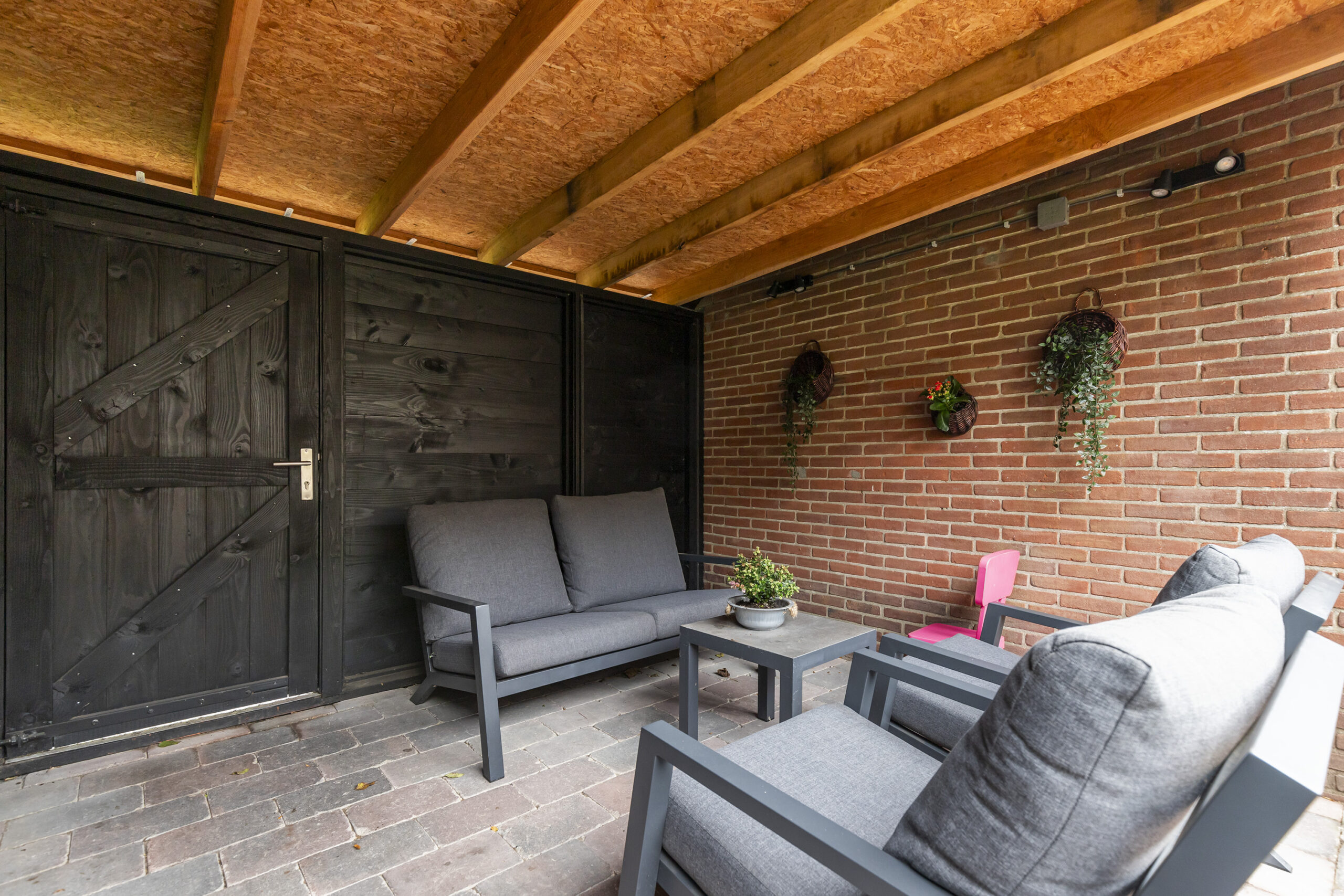 Tussen het groen van de coniferen zit u heerlijk beschut in uw achtertuin. En met een ligging op het zuidwesten kan u al vanaf het vroege voorjaar elke zonnestraal oppikken. Wordt de zon u toch iets te veel? Dan laat u het zonnescherm neer dat is bevestigd aan de achtergevel boven het terras.