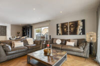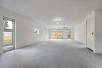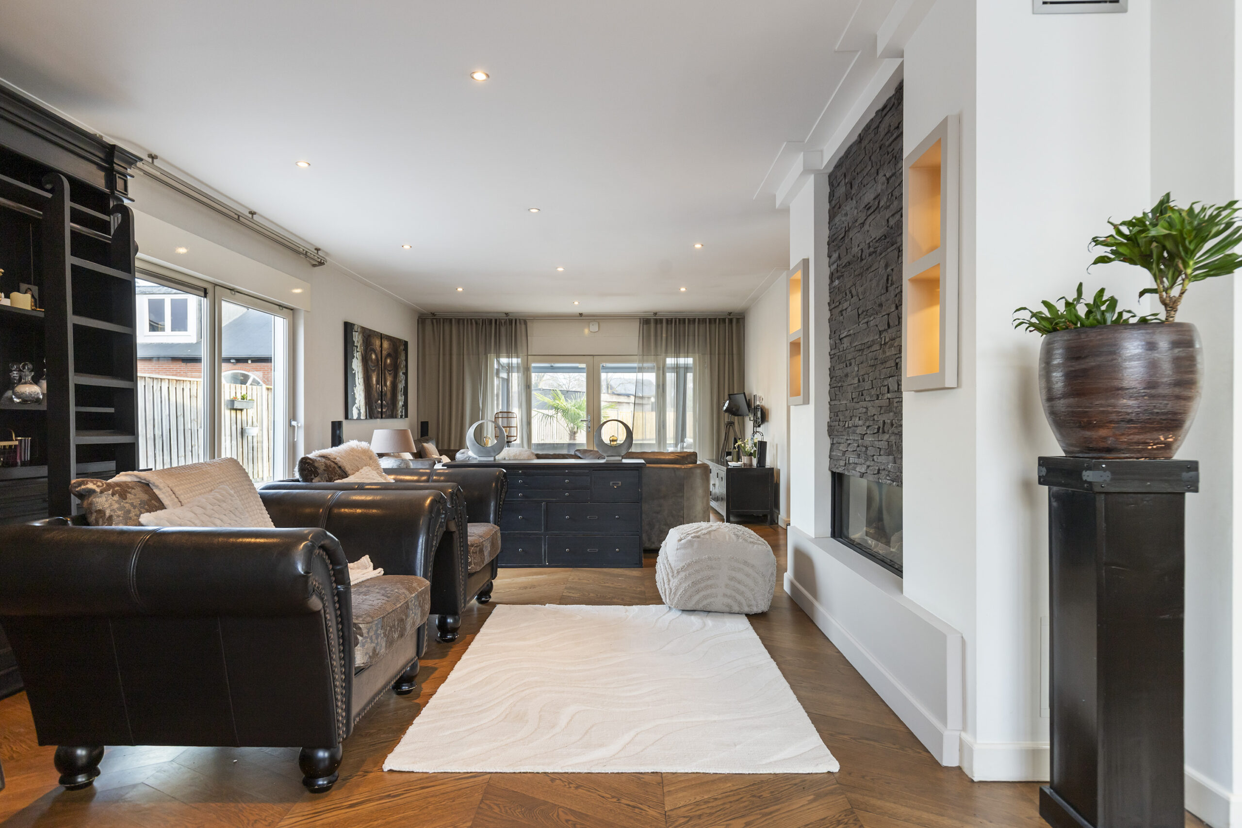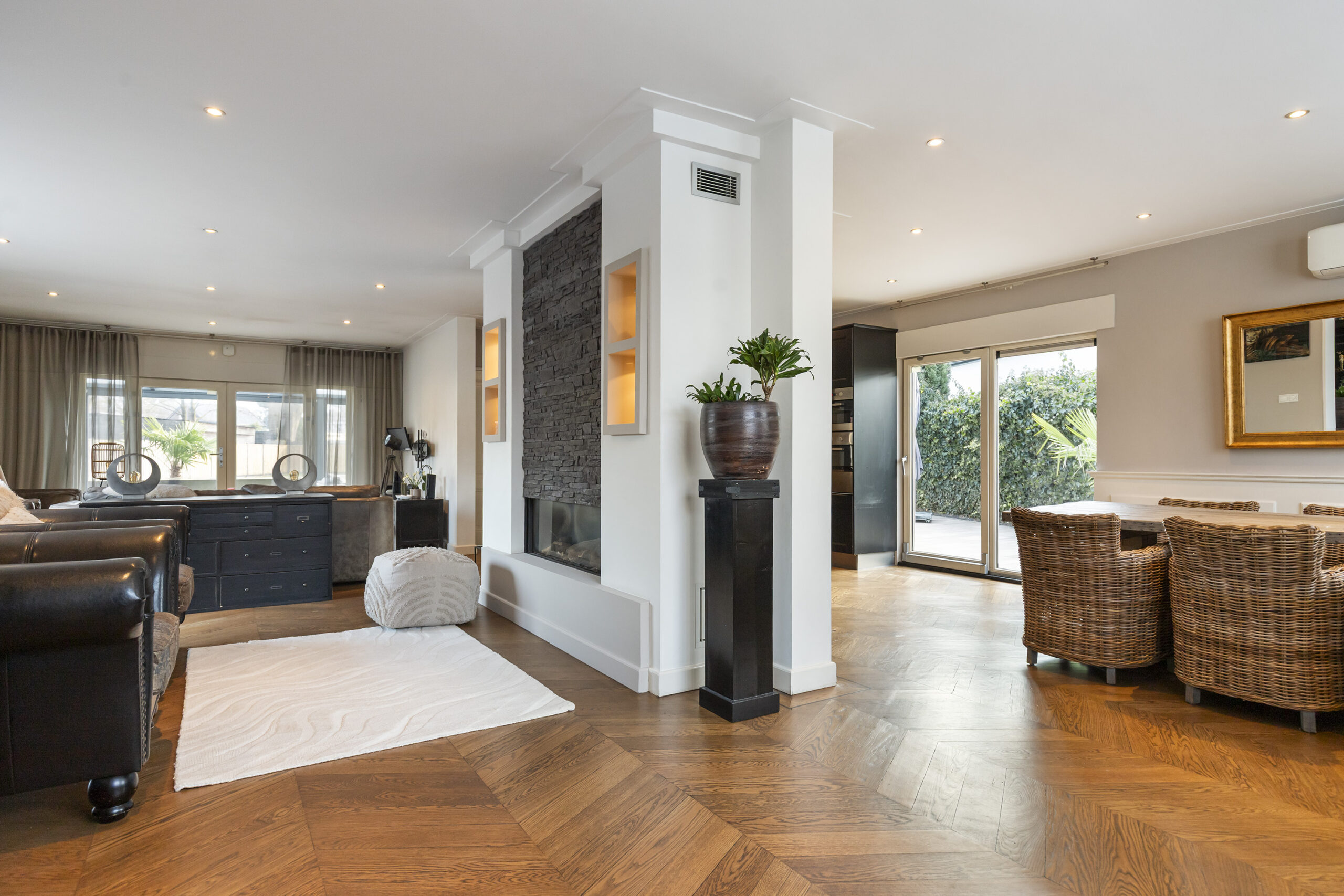 Welkom aan de Loseweg 12 – waar de bescheiden hal achter de voordeur alle ruimte geeft aan een aangename open leefruimte. Komt u verder, dan ziet u wat we bedoelen. Omringd door een warme visgraatvloer, neemt de schouw met gashaard hier een centrale plaats in. Dat levert rondom die schouw mooie ruimtes op om te koken, te tafelen en te loungen. Met schuifpuien/openslaande deuren aan drie kanten van de ruimte, heeft u een open verbinding met buiten.
