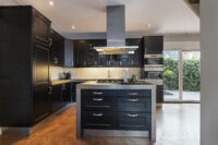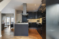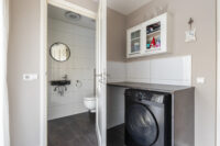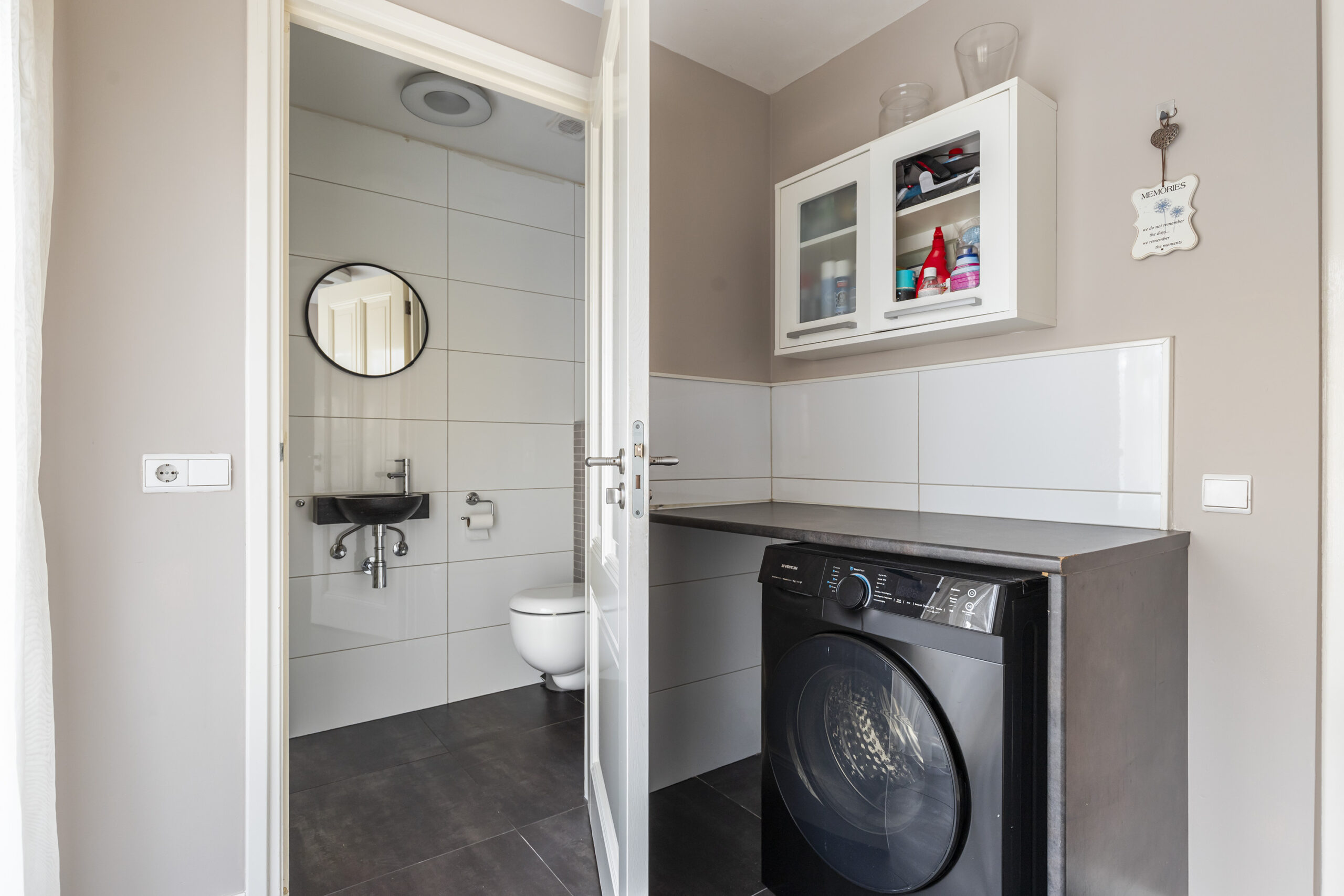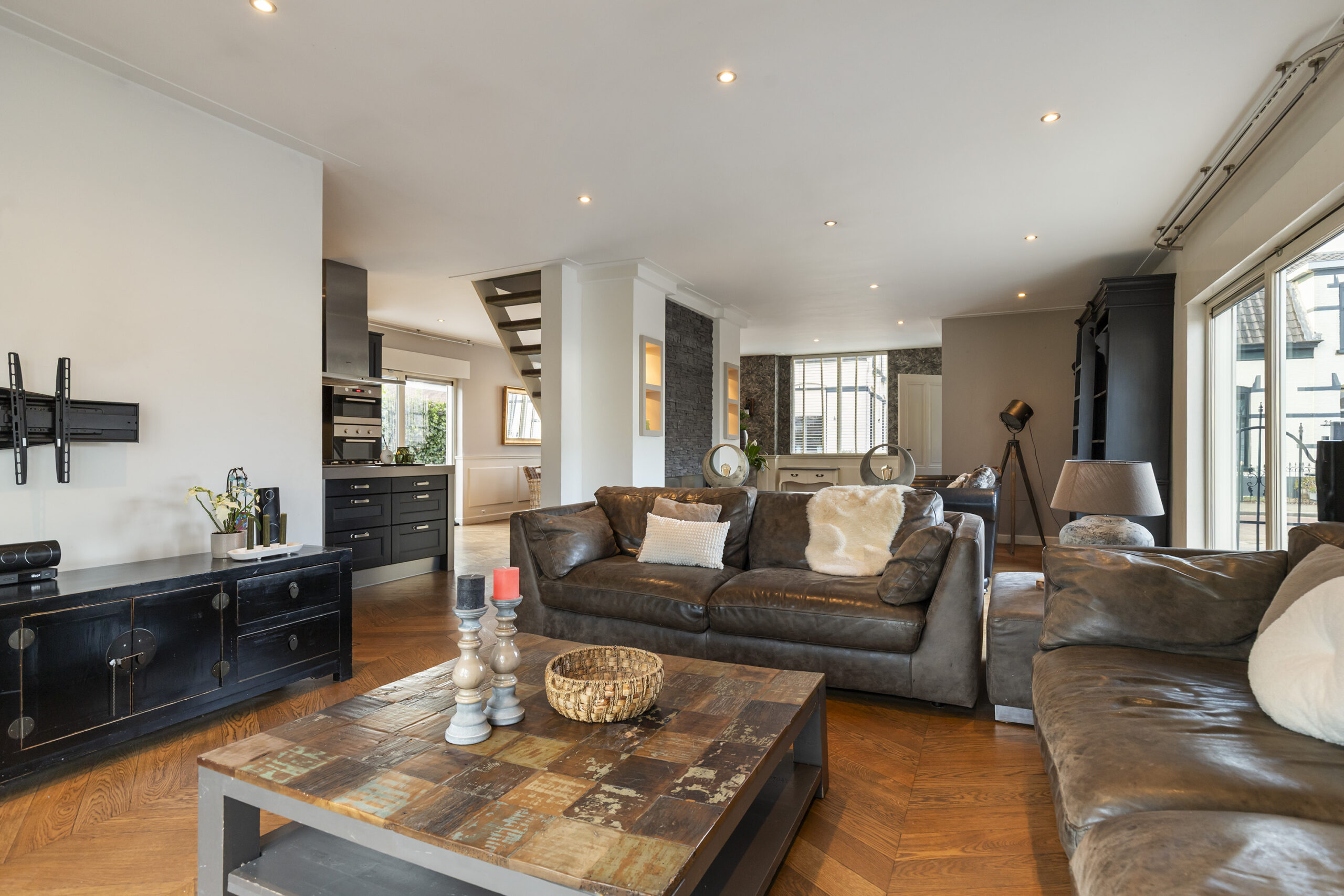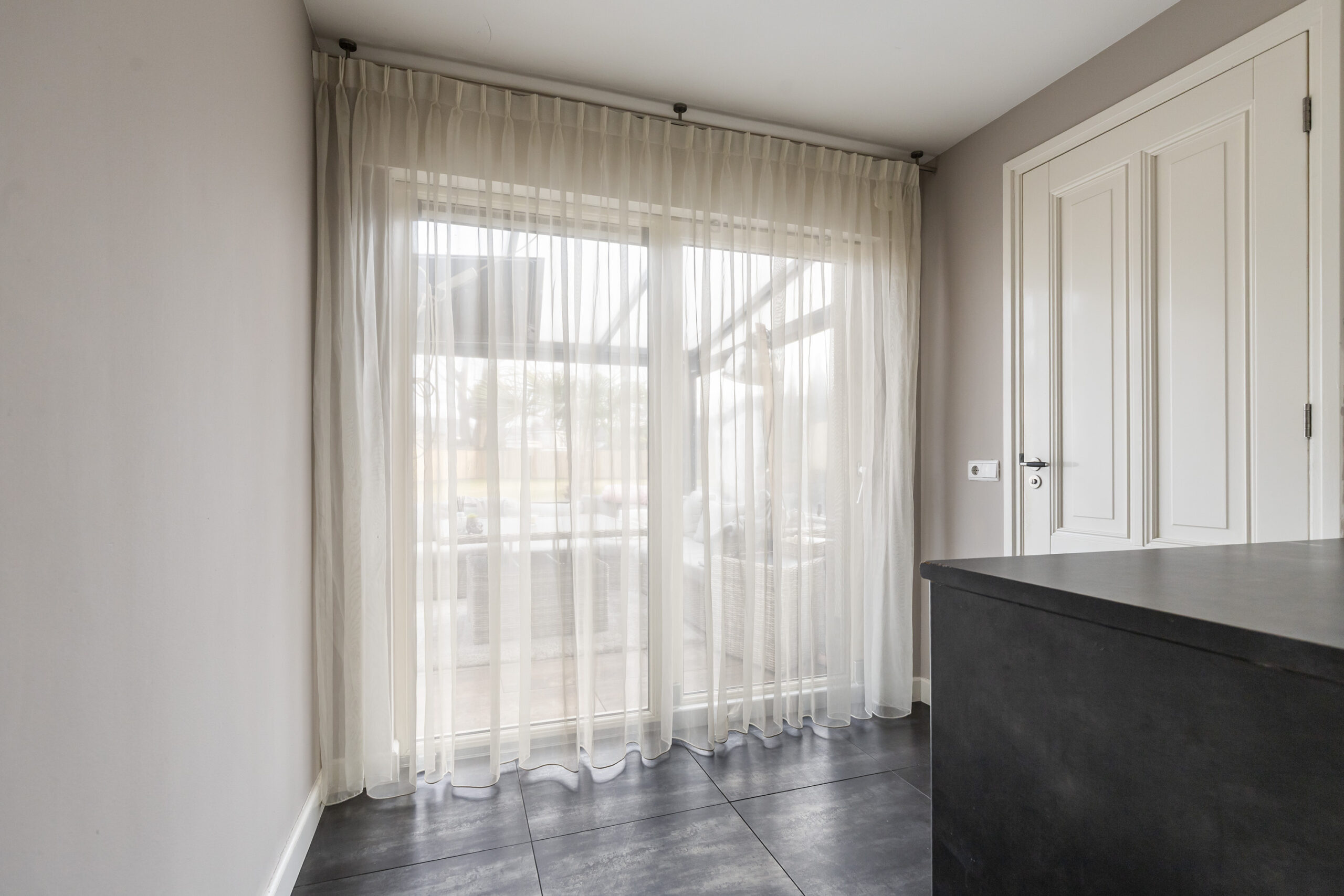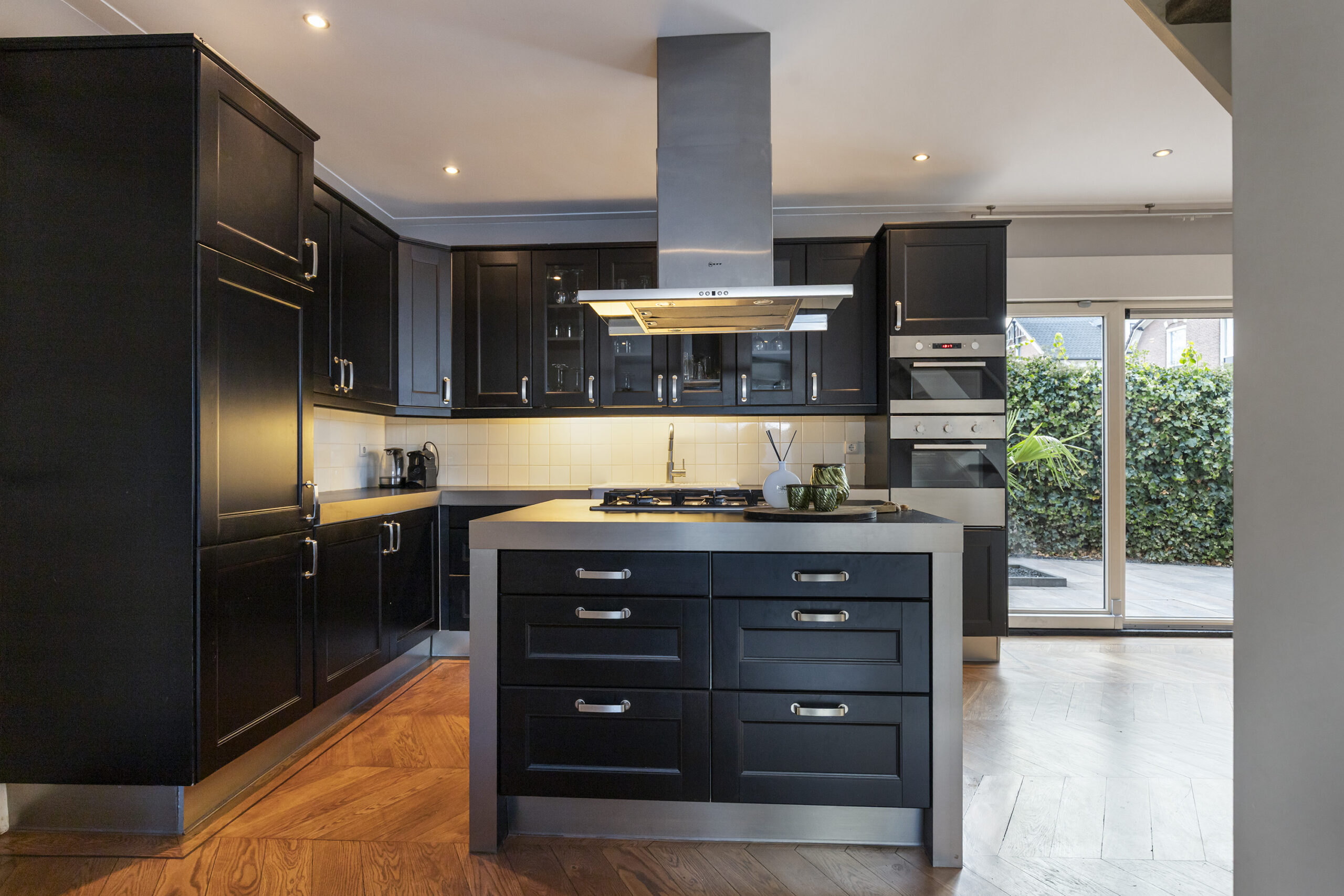 De keuken is in een hoek opgesteld en heeft een kookeiland. De robuuste stijl, zwart in combinatie met rvs, maakt dit geheel tot een echte eyecatcher. Natuurlijk is de keuken uitgerust met alle inbouwapparatuur die daar bij hoort. Achter de keuken vindt u de praktische bijkeuken met wasmachineaansluiting en schuifpui naar de tuin. Ook is hier de toiletruimte; modern ingericht met zwevend closet en fontein. Dit is ook de plek van de cv-installatie.