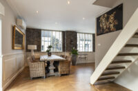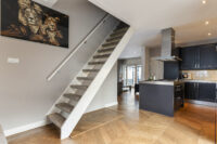 Aan de andere kant van de schouw is – heel ruimte-efficiënt – de trap naar de verdieping. Tegelijk is onder die trap een luik die vrijwel opgaat in de vloer. Onder dit luik is de trap naar de flinke kelder.