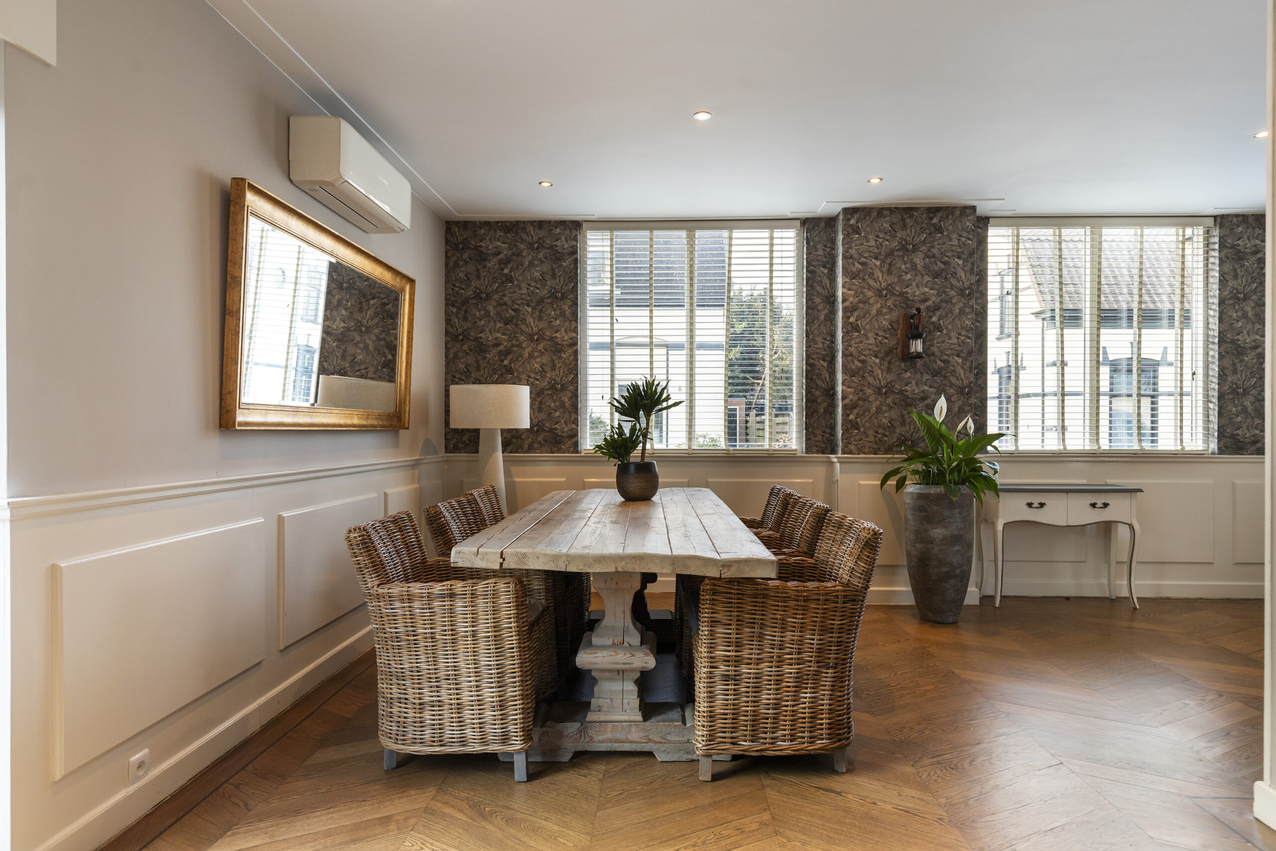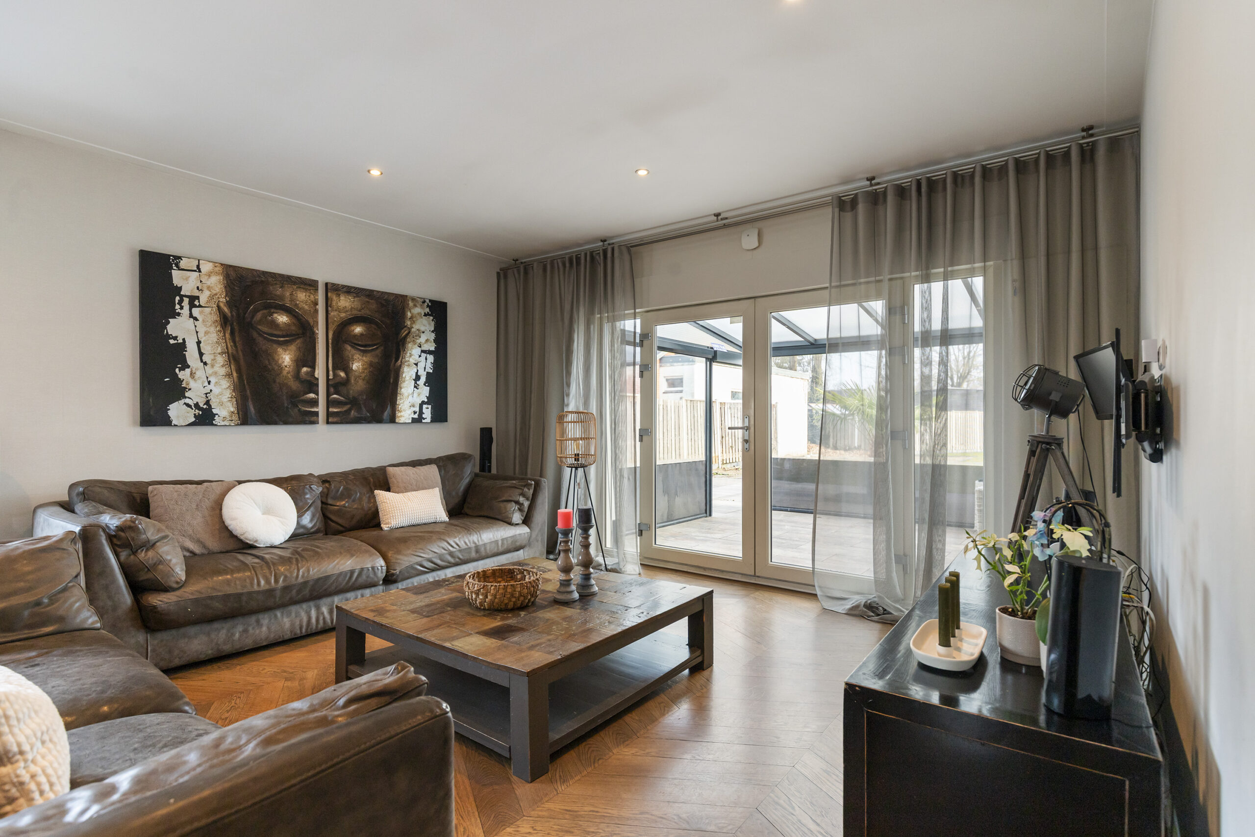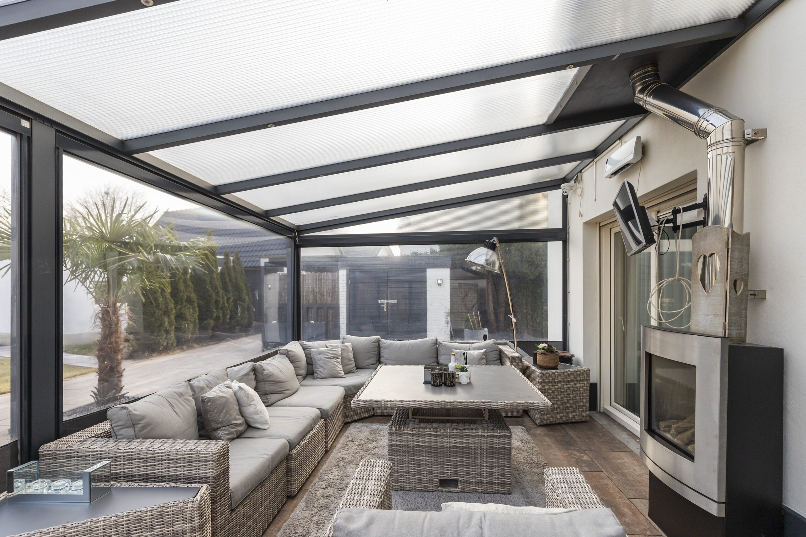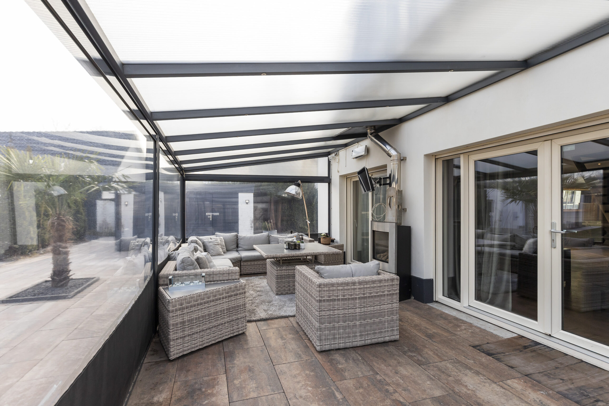 Aangebouwd aan het huis is een grote veranda, met een gashaard als sfeervolle warmtebrenger. Op een warme dag biedt juist de airco hier uitkomst. Hoe warm of koud het ook is, omringd door glas zit u altijd besloten met toch het gevoel van buiten zijn.