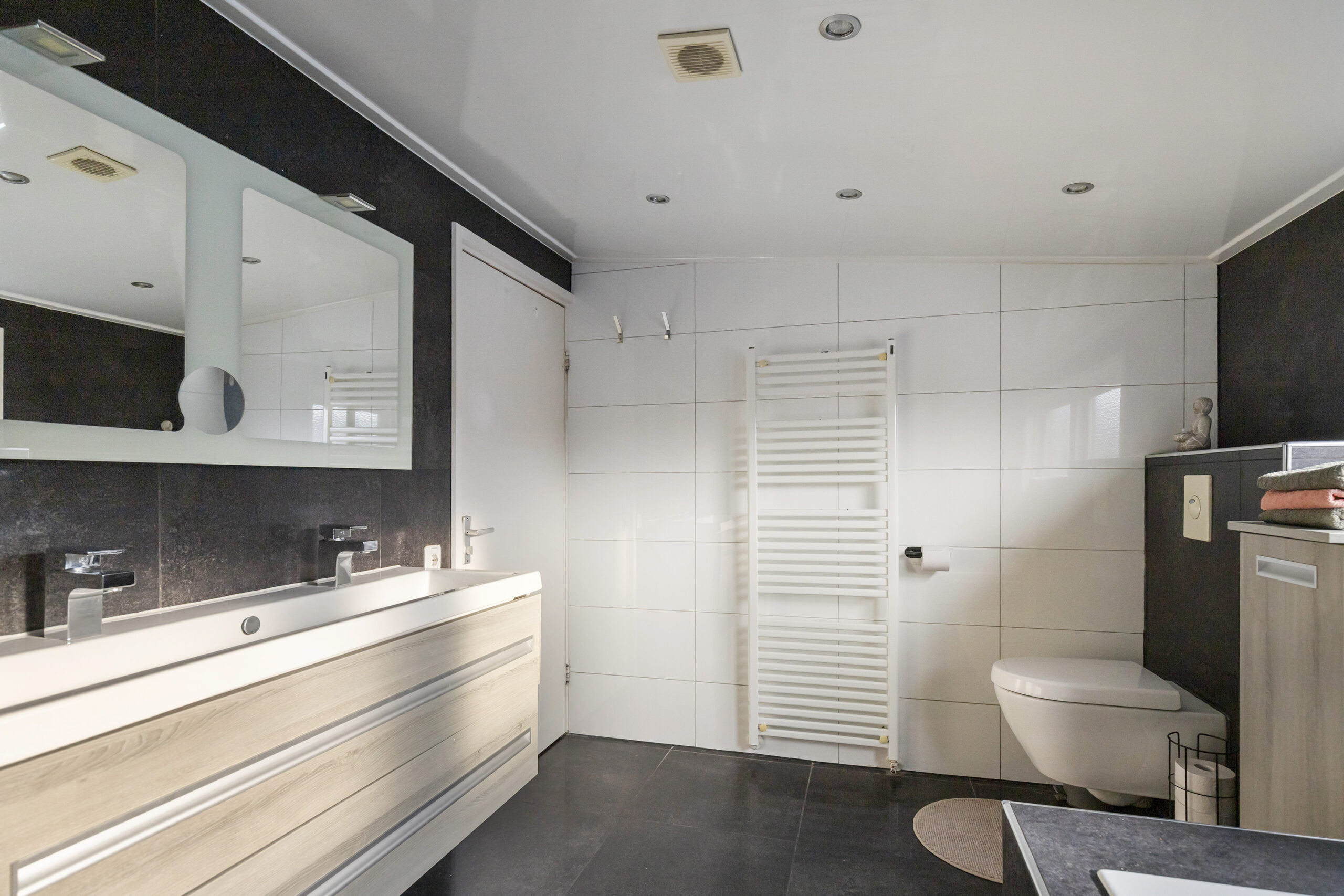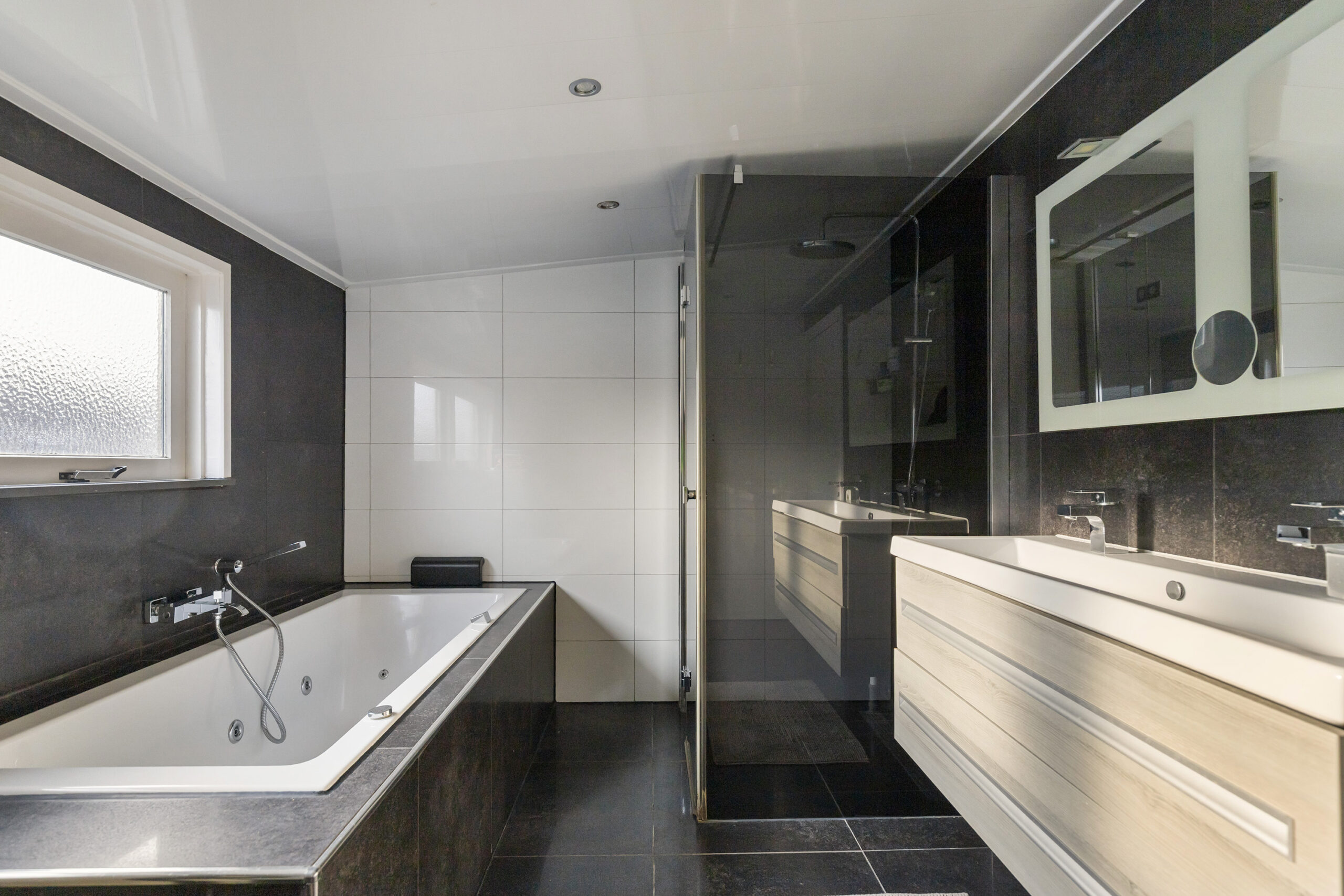 Bovengekomen, stapt u op een kleine overloop met rechts van u de deur naar de badkamer: modern en (met inloopdouche, lig(bubbel)bad, dubbele wastafel met -meubel, zwevend closet, vloerverwarming en designradiator) bijzonder compleet.