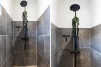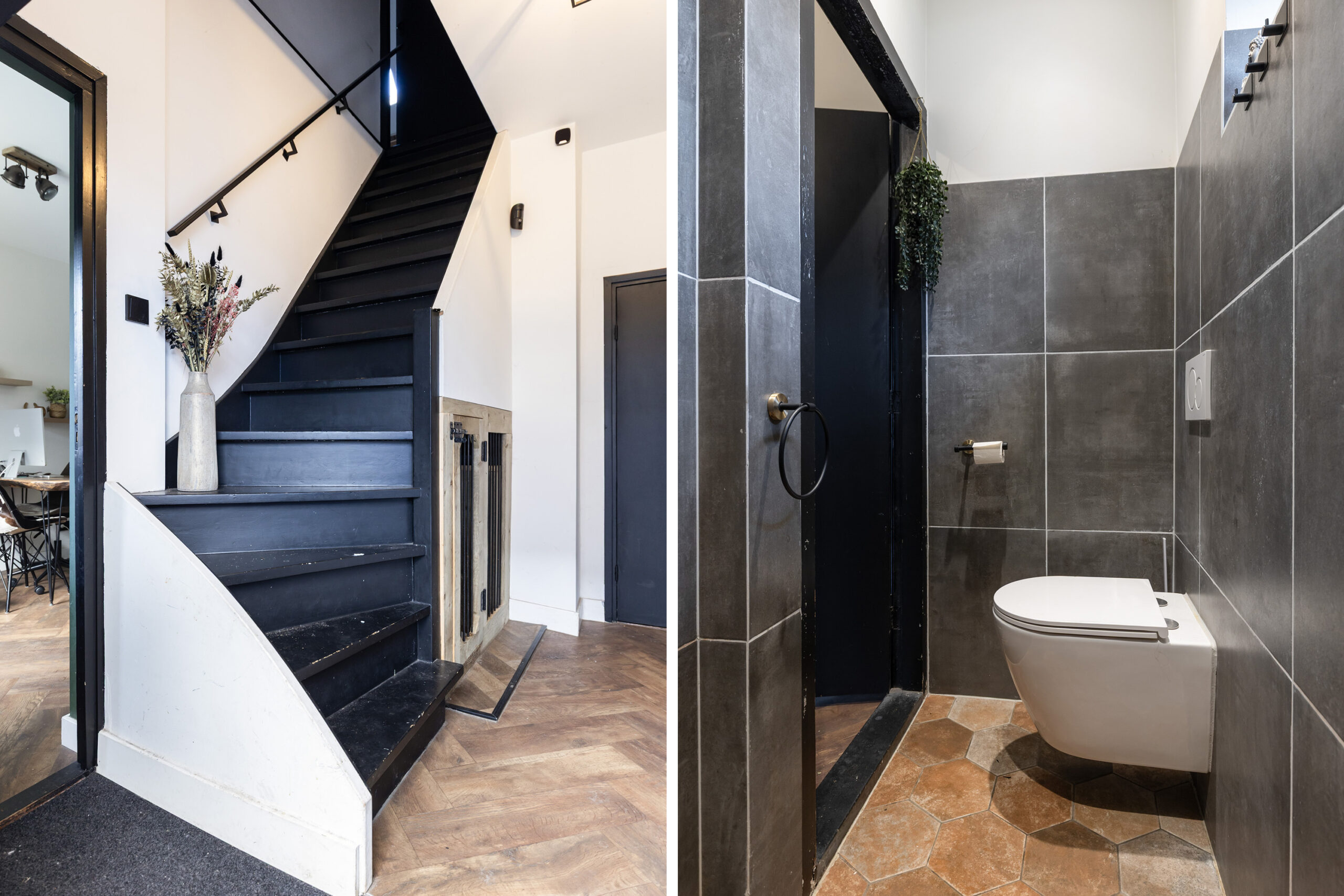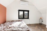 Nu u binnen bent, bent u bijna ongemerkt een vaste kast voorbij gelopen. Hier zijn de cv-ketel en de mechanische ventilatie van de woning geïnstalleerd. Tegenover deze kast is de deur naar een slaapkamer – of wellicht wilt u dit vertrek gebruiken als hobby- of werkkamer of als kantoor aan huis. Loopt u door, aan de trap voorbij, dan volgt rechts van u de deur naar de badkamer; getegeld in warme, moderne kleuren en voorzien van een moderne toilet en een douche.