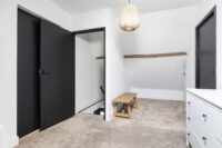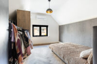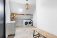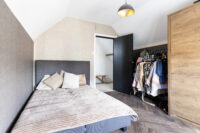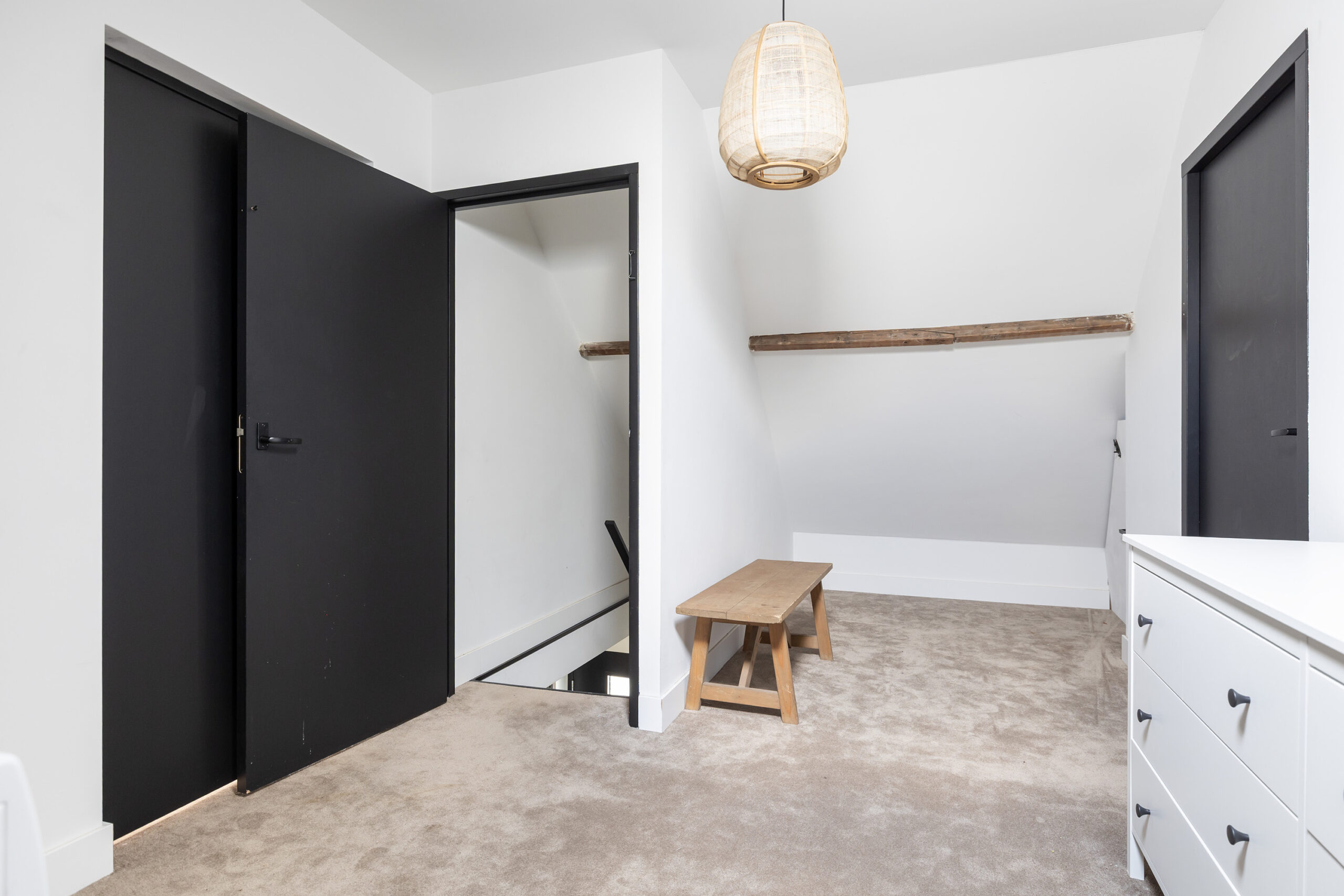 Op de grote overloop boven is plek voor uw wasmachine en -droger. Aan beide kanten van deze overloop treft u een slaapkamer aan; één royale en één van bescheidener formaat, beide met veel praktische bergruimte.